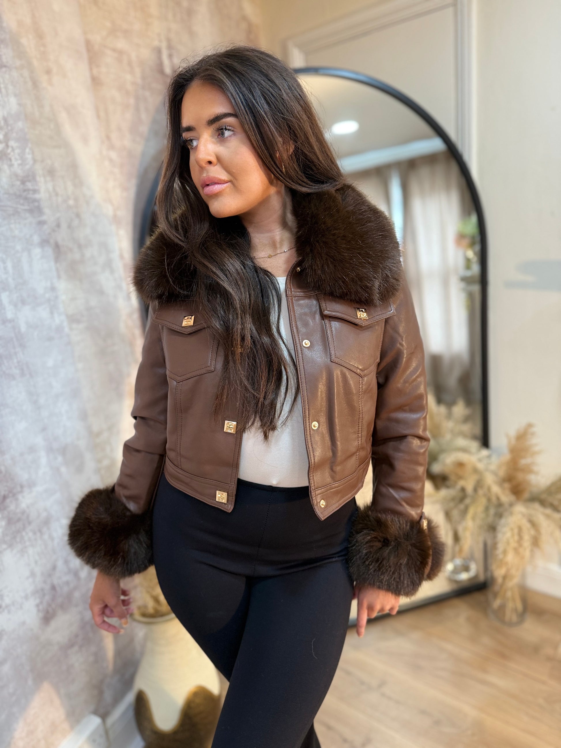 Command attention with this faux leather and fur jacket, a masterclass in contemporary opulence. Crafted from buttery-soft vegan leather, it features a sumptuous faux fur collar, cuffs, and full inner lining that envelop you in warmth and sophistication. The structured silhouette flatters effortlessly, while gleaming gold button fastenings add a touch of refined glamour.