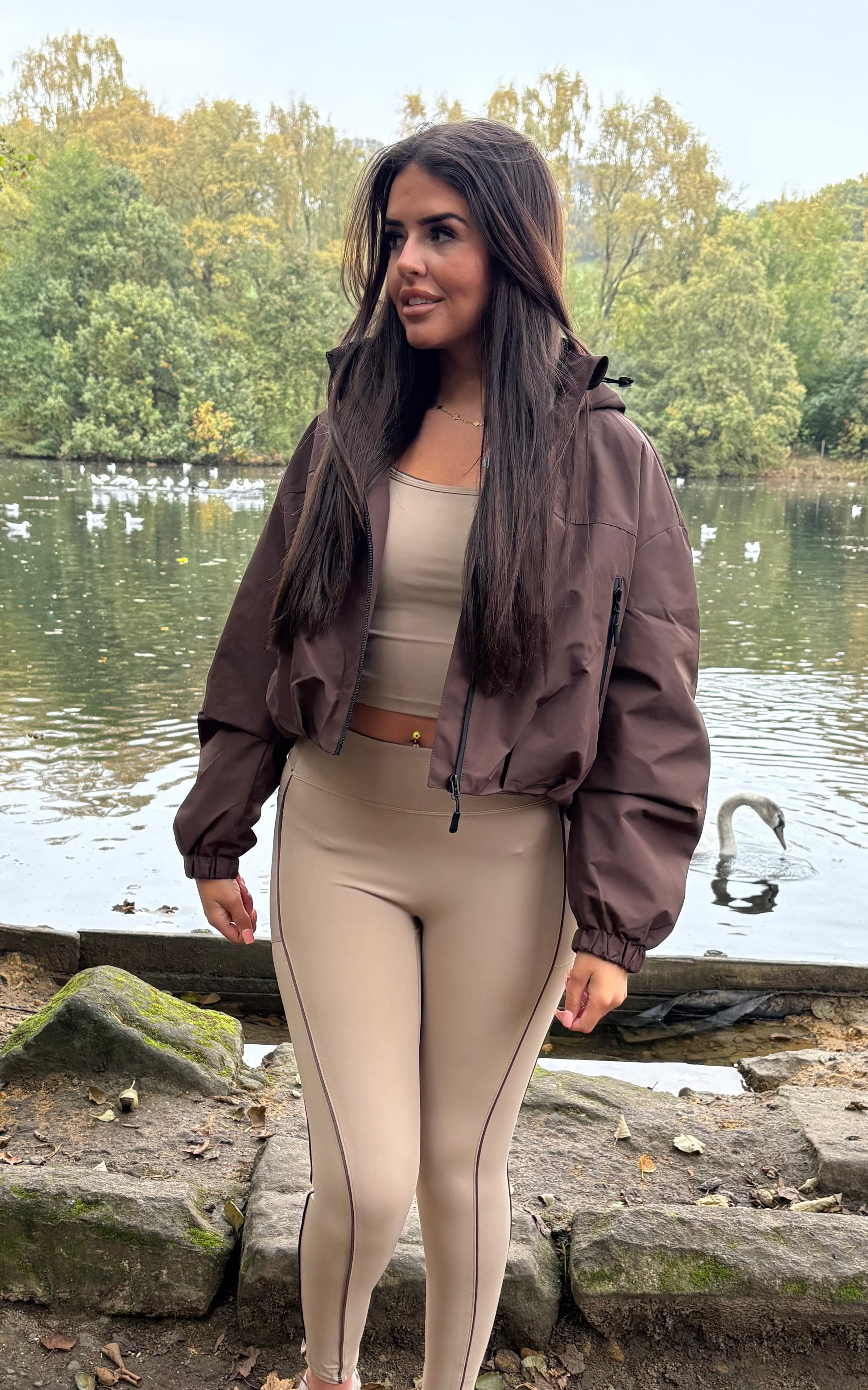 Designed in a rich chocolate hue, this jacket adds a touch of sophistication to any active or everyday look. The water-resistant finish keeps you dry and comfortable through light rain or unpredictable weather, while the cropped fit flatters your silhouette without sacrificing ease of movement.