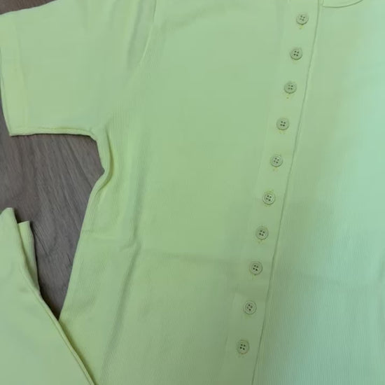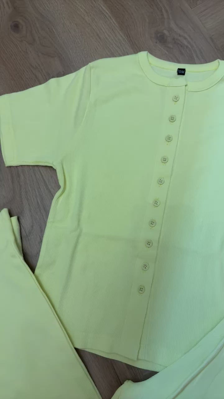 Fresh, comfy, and effortlessly put together. This two-piece co-ord set features a soft knit short-sleeve button-down top paired with matching relaxed-fit trousers. Designed in a bright lime hue, it’s the perfect balance of casual comfort and polished style.