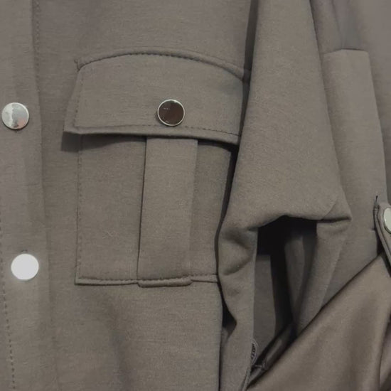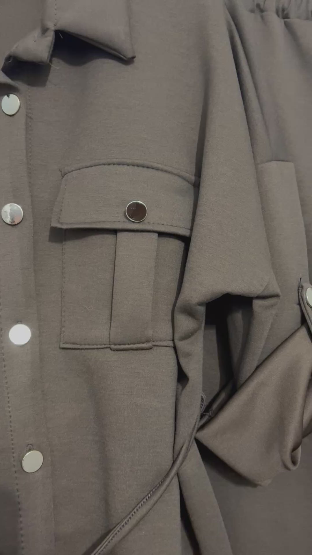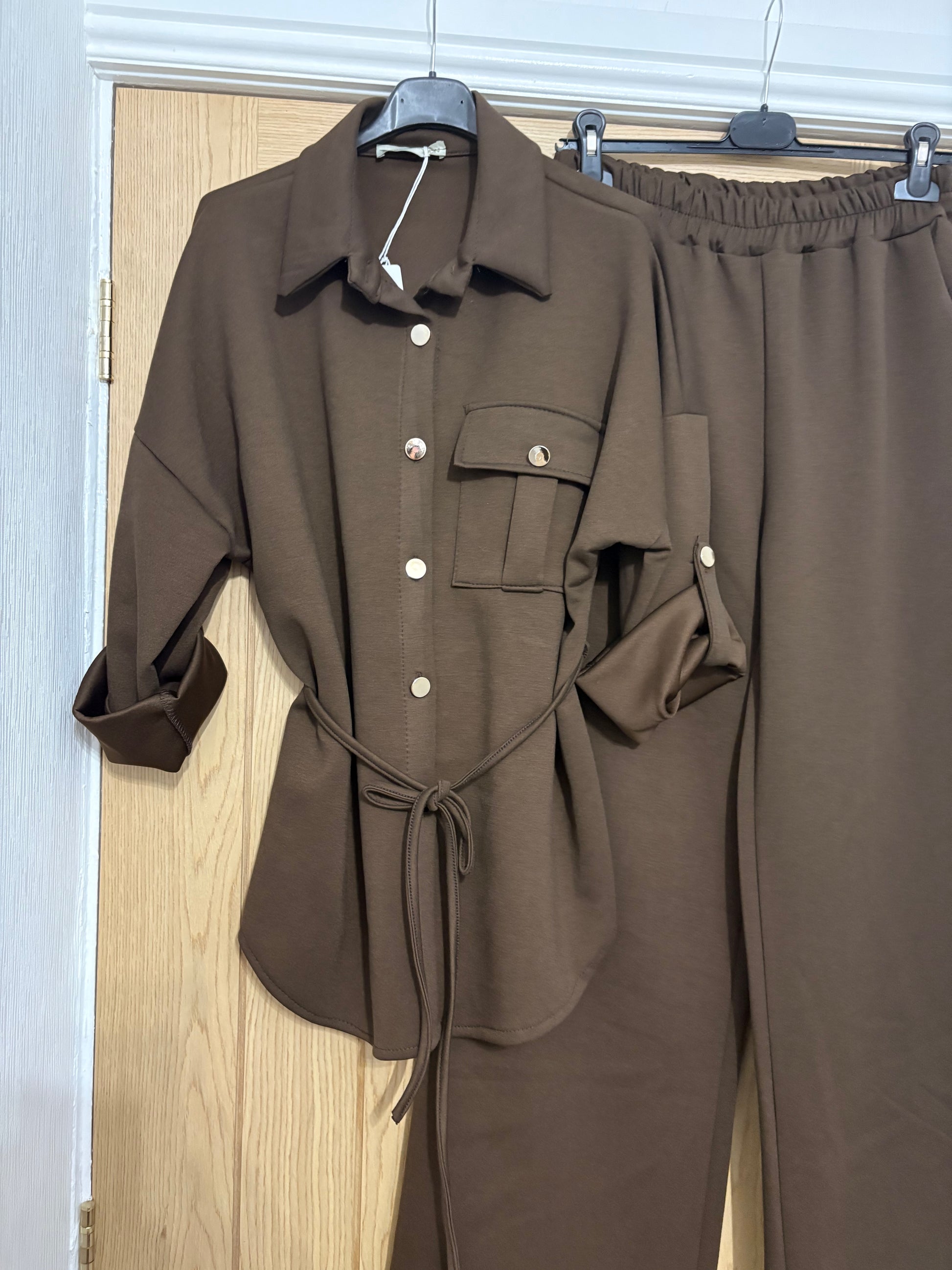 Effortless polish meets everyday comfort in this chic two-piece co-ord. Crafted in a rich chocolate-brown tone, the set features a relaxed button-through shirt with a classic collar, utility-style chest pocket, and adjustable tie waist for a flattering, cinched silhouette. The sleeves can be worn rolled up or down for versatile styling.